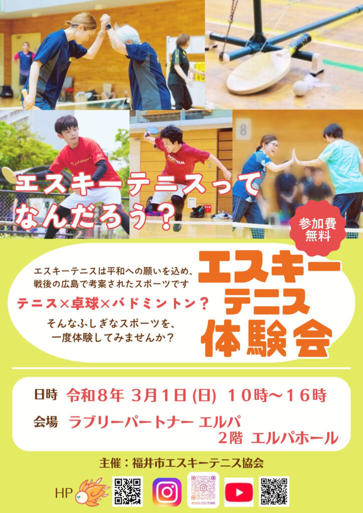 令和8年3月1日(日)、ラブリーパートナーエルパ2階のエルパホールにおいて、福井市協会主催のエスキーテニス体験会を開催いたします。県内ショッピングセンターでは初の体験会です。未経験者大歓迎、生涯スポーツとしても楽しめるエスキーテニス。是非この機会にエスキーテニスに触れ、競技の楽しさを体感していただければと思います! 開催時間は10時~16時です。皆様のご来場をお待ちしております!
