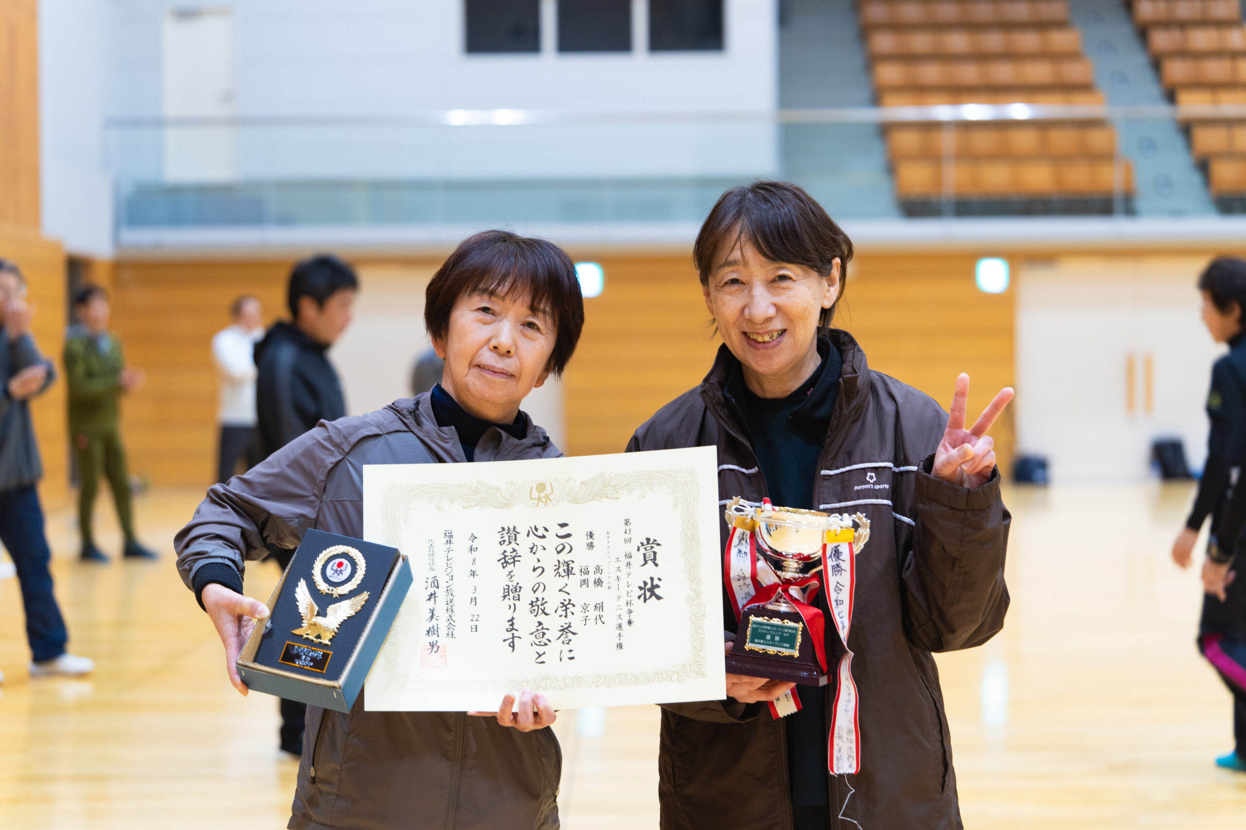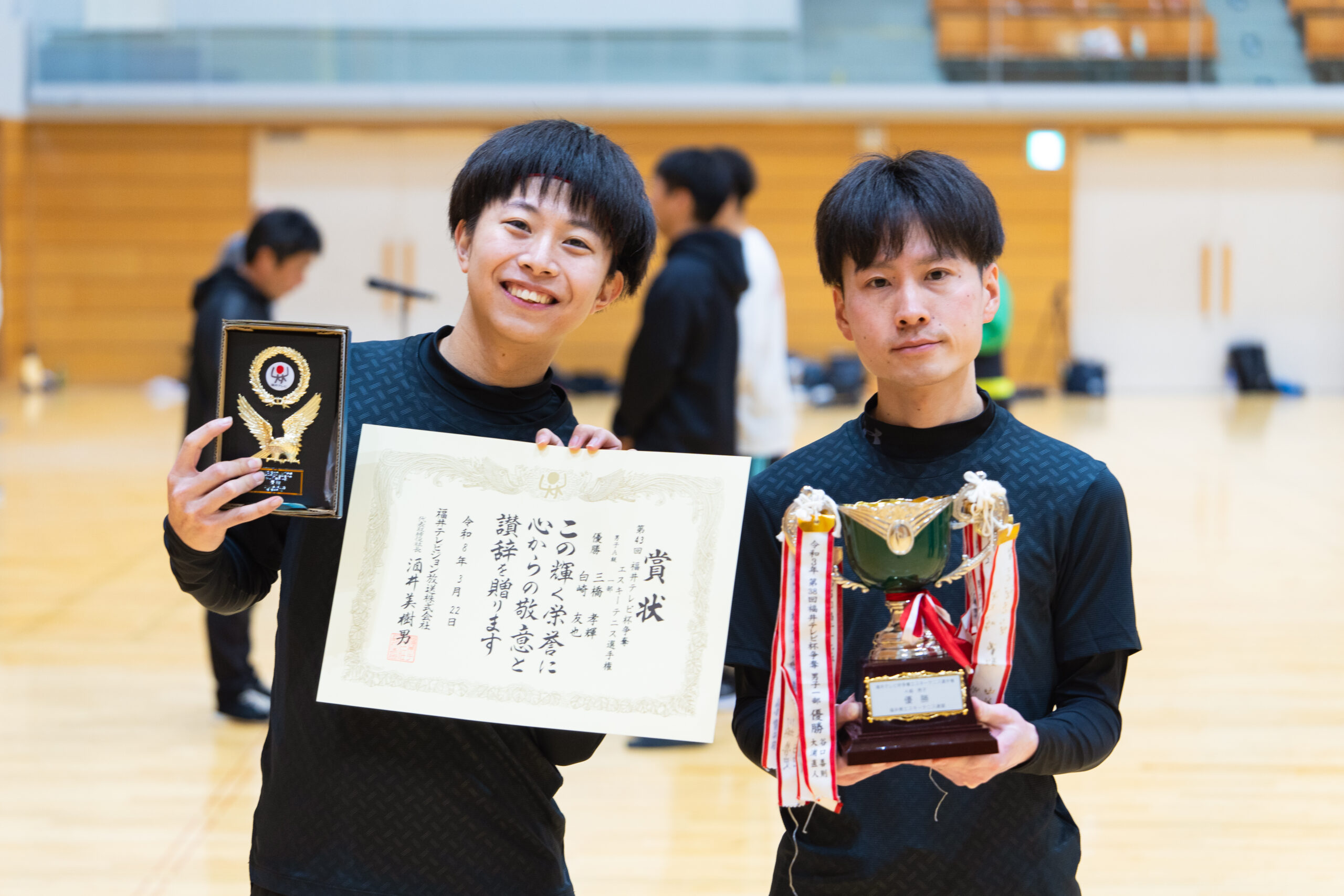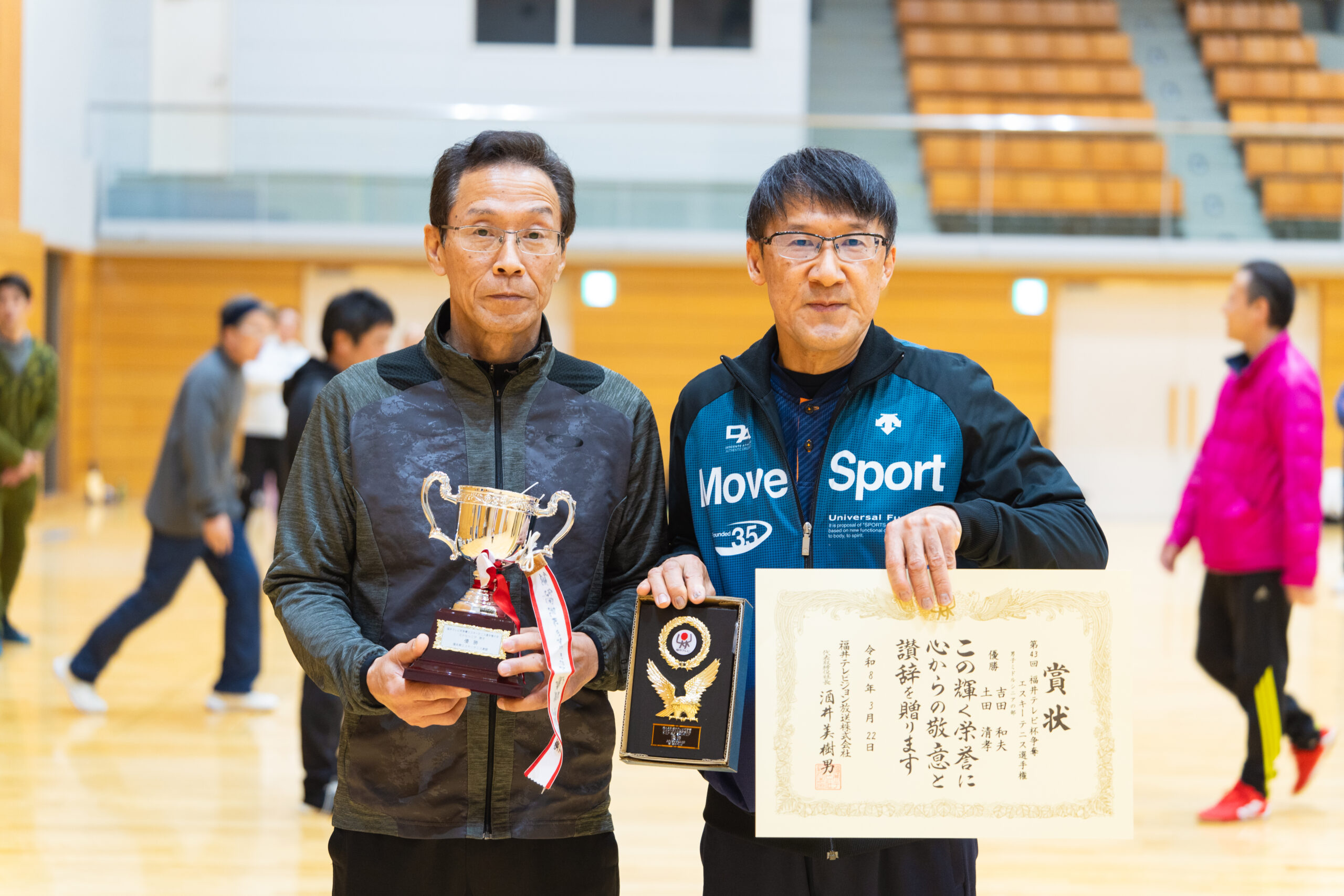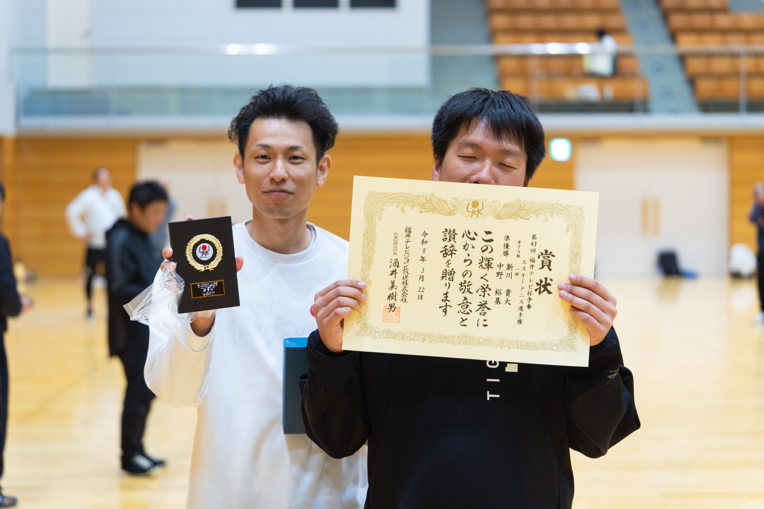 2026.03.30 第43回福井テレビ杯争奪エスキーテニス選手権大会 令和8年3月22日(日)、福井市体育館において第43回となる福井テレビ杯争奪エスキーテニス選手権大会が開催されました! 本大会は福井県の個人ダブルスのチャンピオンを決定する大会で、一般A級の部、ミドルシニアの部(50歳~)、アクティブシニアの部(65歳~)の3部門に加えて、交流(一般B級)の部も実施いたしました。また今回も広島県、大阪府、鳥取県等14名の他県県選手の参加もいただき、大変盛り上がった大会となりました! 大会の結果は下記の通りです。入賞された選手の皆様、おめでとうございました! また参加された選手の皆様もお疲れさまでした! 一般A級男子 優勝 白崎友也・三橋孝輝(宝永体協) 準優勝 新川貴大(GO広島)・中野裕基(安東) 第三位 福井健太郎・杉本幸正(Escit) 一般A級女子 優勝 川端菜穂(東陽)・笹本清香(チーム円山) 準優勝 佐々木友記子(啓蒙)・竹原美佳(安居) 第三位 三橋梨奈・浅野華妃(オール社) 一般B級 優勝 里信秀和(オール社)・尾田幸司(東陽) ミドルシニア男子 優勝 吉田和夫(みのり)・土田清孝(北中山) 準優勝 松村康弘(オール社)・古川大輔(和田) 第三位 宮本光一郎(安居)・松川勝巳(丸岡くらぶ) ミドルシニア女子 優勝 野坂暁美(文殊)・村田千恵美(チーム円山) 準優勝 片岡八千代(明新)・岡井和美(文殊) 第三位 広瀬幸恵・林まり子(ホワイトピース) アクティブシニア男子 優勝 鈴木純二(国高)・大道照雄(上庄) 準優勝 野原修二・大久保隼人(北中山) 第三位 高木茂(中藤)・齋藤雄一郎(フレンズ結) アクティブシニア女子 優勝 高橋絹代・福岡京子(鯖江ウィンズ) 準優勝 大道久美子(上庄)・川崎千鶴子(松本) 第三位 江端美智子・藤田奈緒美(清明) 一般A級男子優勝 白崎・三橋ペア 一般A級男子準優勝 新川・中野ペア 一般A級男子第三位 福井・杉本ペア 一般A級女子優勝 川端・笹本ペア 一般A級女子準優勝 佐々木・竹原ペア 一般A級女子第三位 三橋・浅野ペア ミドルシニア男子 優勝 吉田・土田ペア ミドルシニア女子優勝 野坂・村田ペア アクティブシニア男子優勝 鈴木・大道ペア アクティブシニア女子優勝 高橋・福岡ペア 一般B級優勝 里信・尾田ペア 令和7年度県民スポーツ祭 前の記事