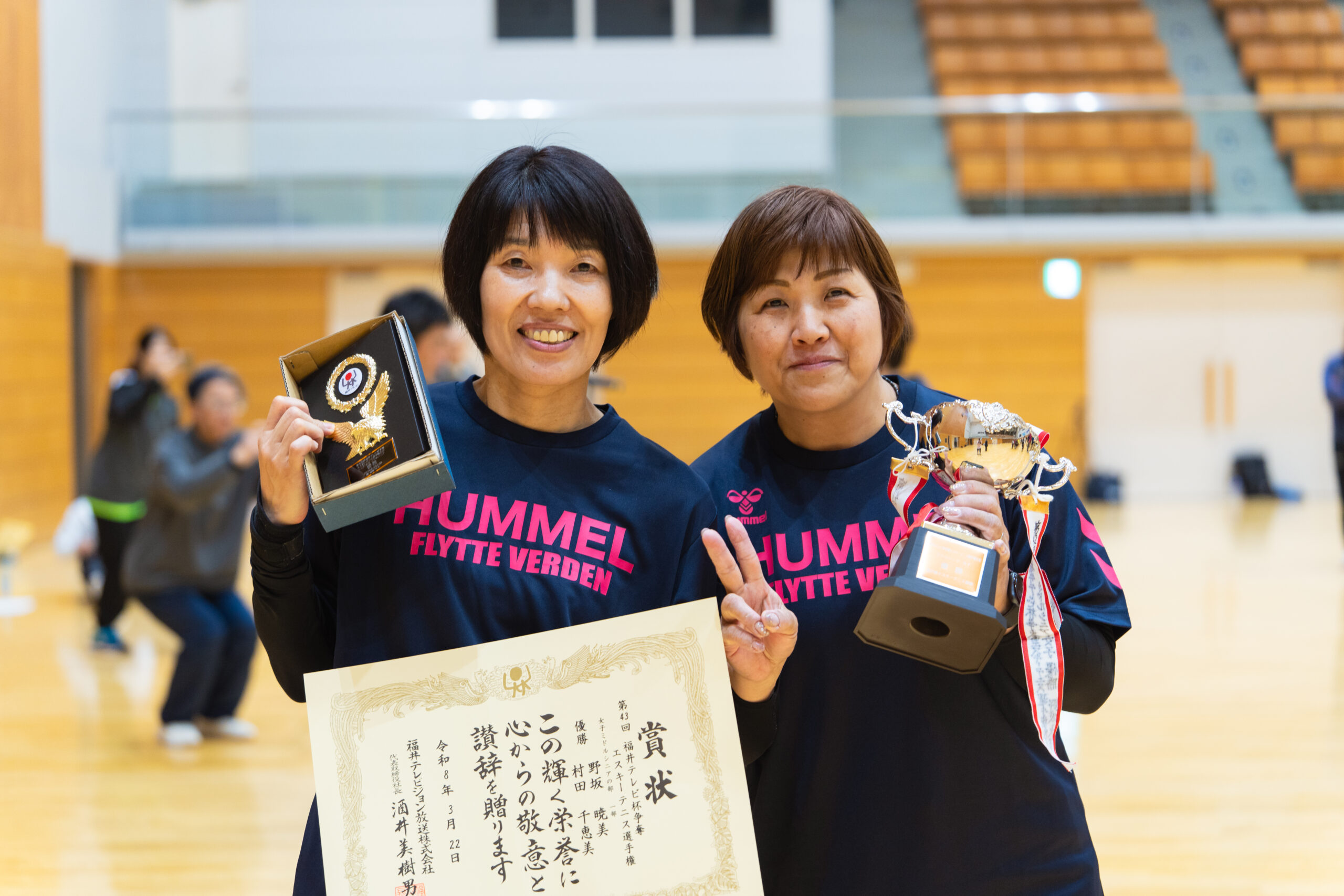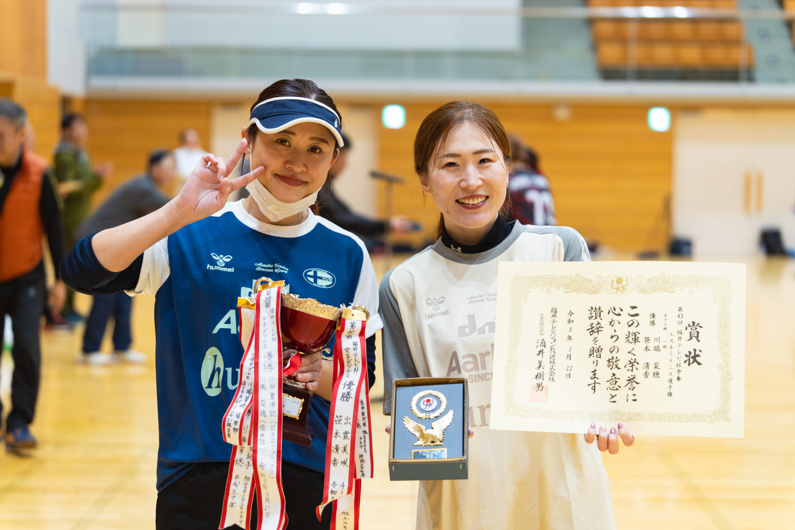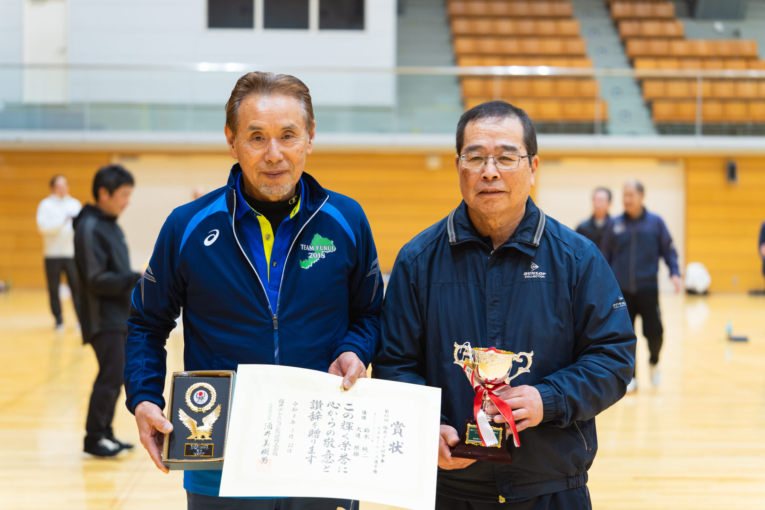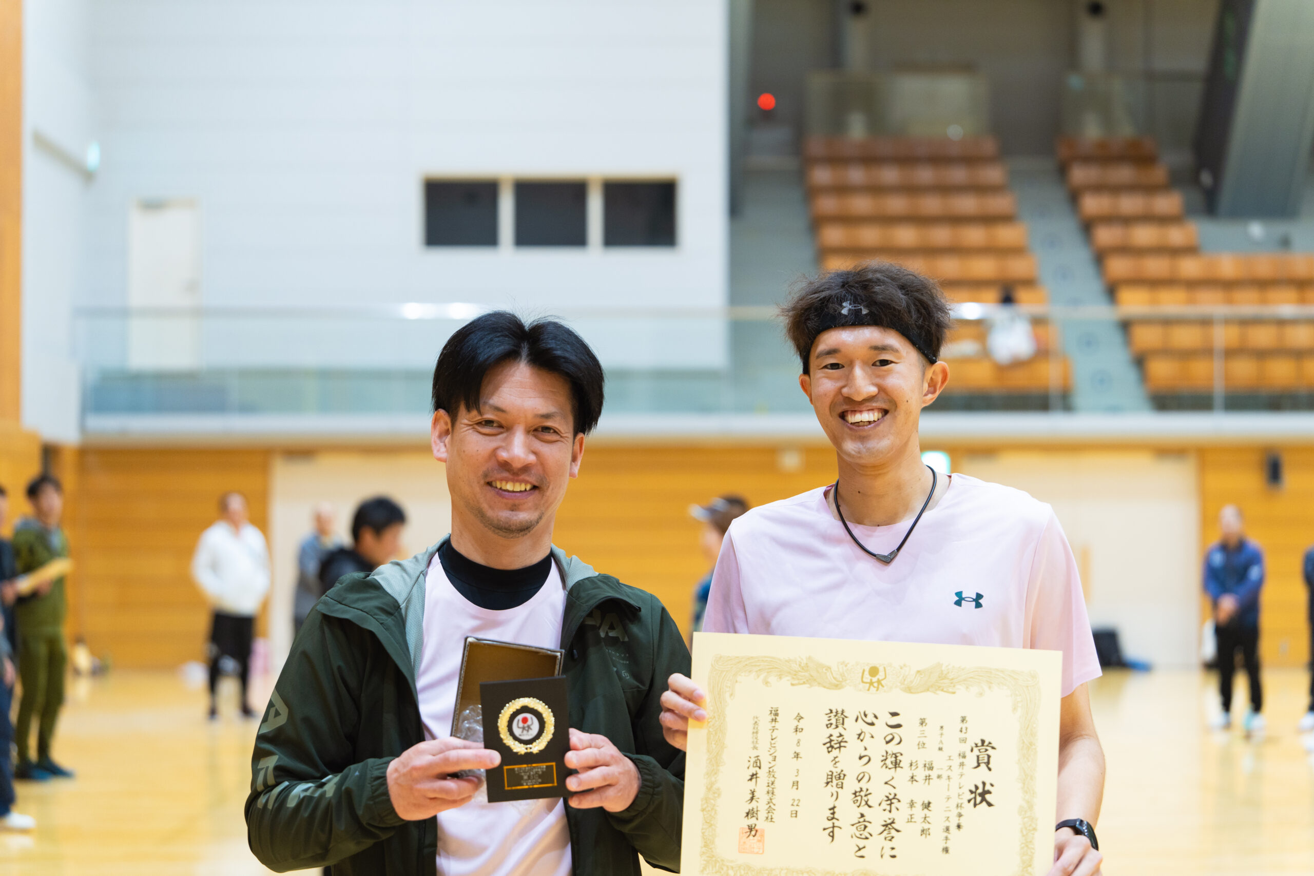 2026.03.30 第43回福井テレビ杯争奪エスキーテニス選手権大会 令和8年3月22日(日)、福井市体育館において第43回となる福井テレビ杯争奪エスキーテニス選手権大会が開催されました! 本大会は福井県の個人ダブルスのチャンピオンを決定する大会で、一般A級の部、ミドルシニアの部(50歳~)、アクティブシニアの部(65歳~)の3部門に加えて、交流(一般B級)の部も実施いたしました。また今回も広島県、大阪府、鳥取県等14名の他県県選手の参加もいただき、大変盛り上がった大会となりました! 大会の結果は下記の通りです。入賞された選手の皆様、おめでとうございました! また参加された選手の皆様もお疲れさまでした! 一般A級男子 優勝 白崎友也・三橋孝輝(宝永体協) 準優勝 新川貴大(GO広島)・中野裕基(安東) 第三位 福井健太郎・杉本幸正(Escit) 一般A級女子 優勝 川端菜穂(東陽)・笹本清香(チーム円山) 準優勝 佐々木友記子(啓蒙)・竹原美佳(安居) 第三位 三橋梨奈・浅野華妃(オール社) 一般B級 優勝 里信秀和(オール社)・尾田幸司(東陽) ミドルシニア男子 優勝 吉田和夫(みのり)・土田清孝(北中山) 準優勝 松村康弘(オール社)・古川大輔(和田) 第三位 宮本光一郎(安居)・松川勝巳(丸岡くらぶ) ミドルシニア女子 優勝 野坂暁美(文殊)・村田千恵美(チーム円山) 準優勝 片岡八千代(明新)・岡井和美(文殊) 第三位 広瀬幸恵・林まり子(ホワイトピース) アクティブシニア男子 優勝 鈴木純二(国高)・大道照雄(上庄) 準優勝 野原修二・大久保隼人(北中山) 第三位 高木茂(中藤)・齋藤雄一郎(フレンズ結) アクティブシニア女子 優勝 高橋絹代・福岡京子(鯖江ウィンズ) 準優勝 大道久美子(上庄)・川崎千鶴子(松本) 第三位 江端美智子・藤田奈緒美(清明) 一般A級男子優勝 白崎・三橋ペア 一般A級男子準優勝 新川・中野ペア 一般A級男子第三位 福井・杉本ペア 一般A級女子優勝 川端・笹本ペア 一般A級女子準優勝 佐々木・竹原ペア 一般A級女子第三位 三橋・浅野ペア ミドルシニア男子 優勝 吉田・土田ペア ミドルシニア女子優勝 野坂・村田ペア アクティブシニア男子優勝 鈴木・大道ペア アクティブシニア女子優勝 高橋・福岡ペア 一般B級優勝 里信・尾田ペア 令和7年度県民スポーツ祭 前の記事